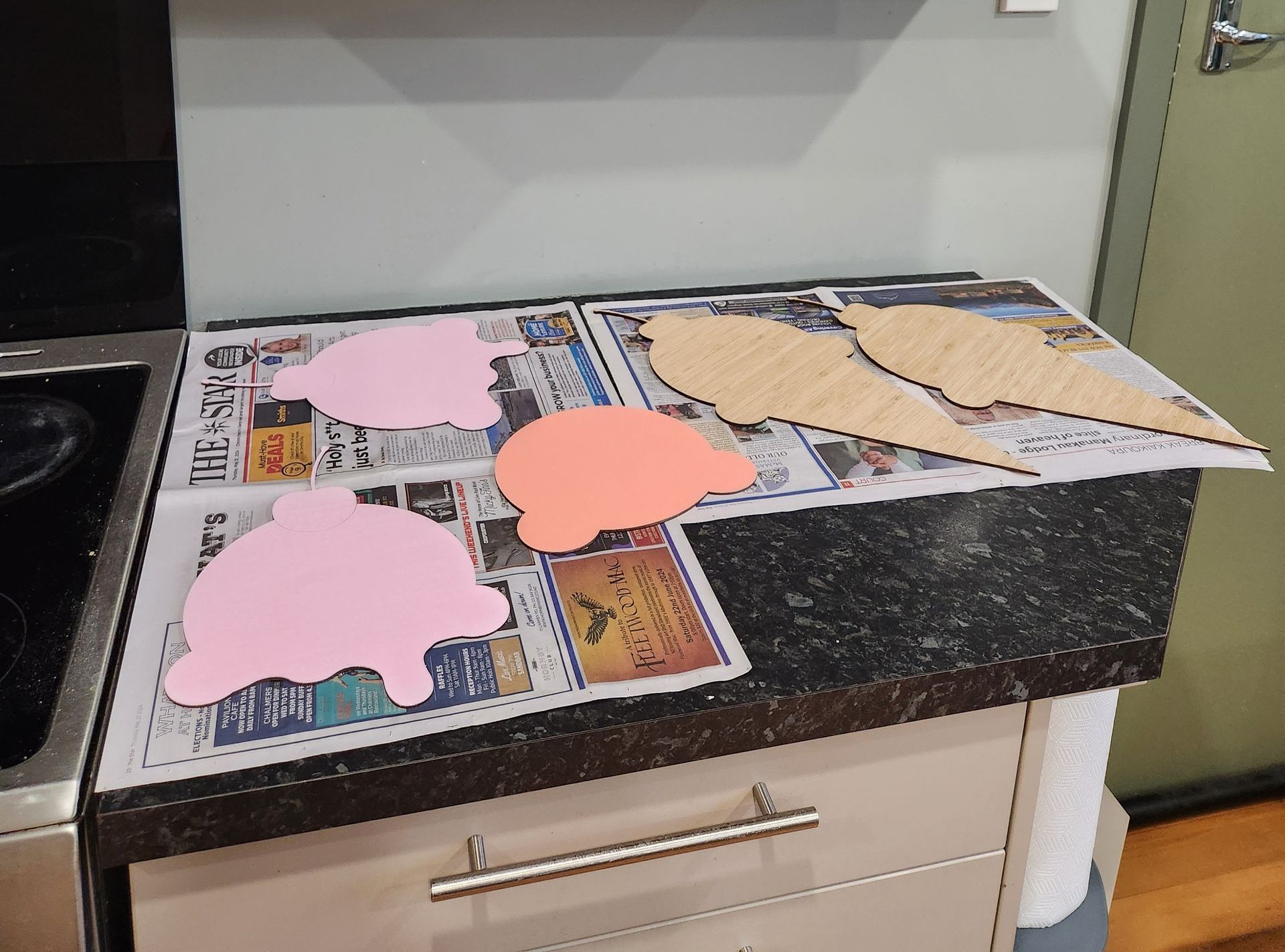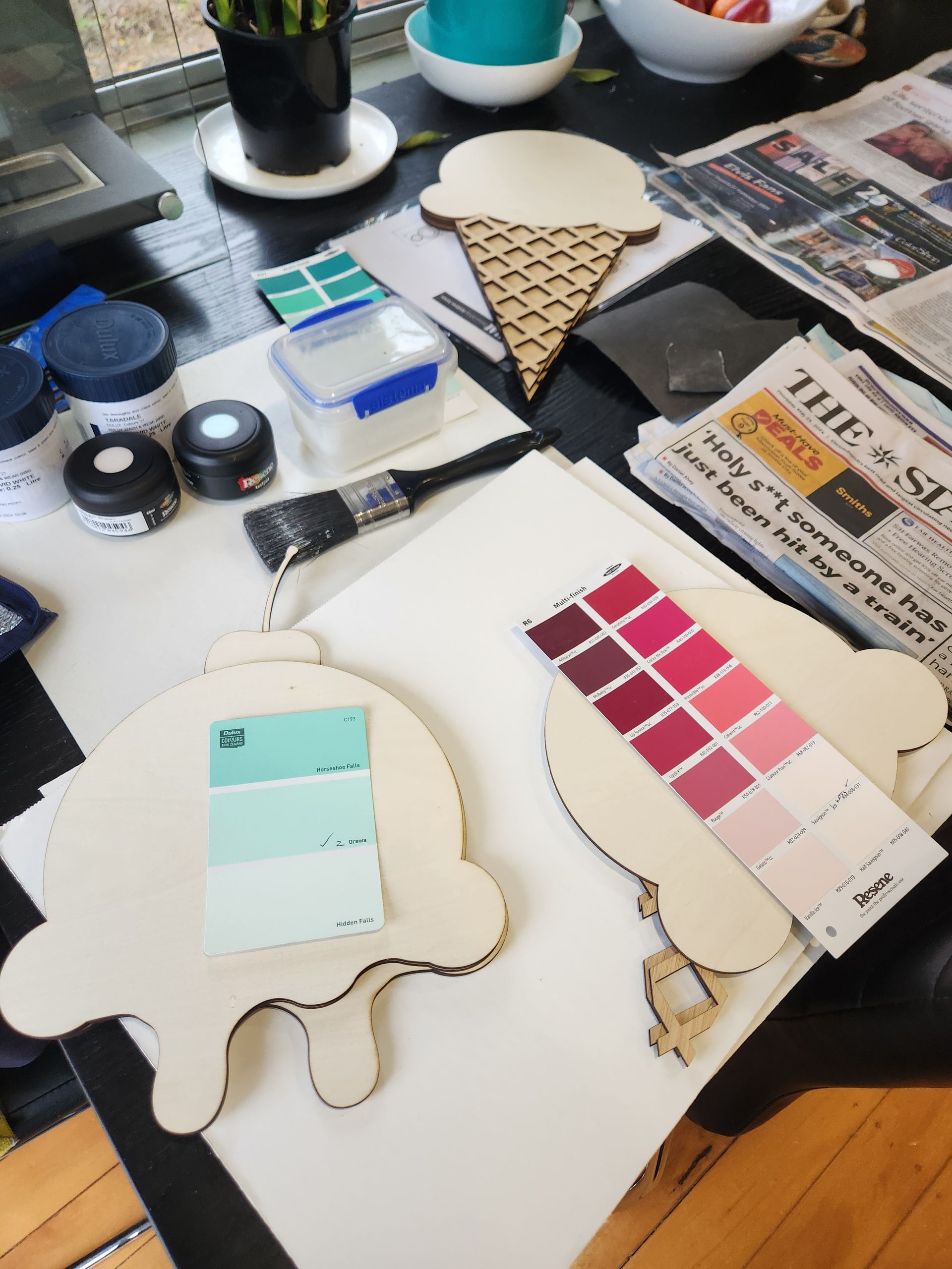 We colour matched our digital concept design to paint colours from both Resene and Dulux. We chose colours that looked good together, some of which did end up varying slightly from the initial concept colours. We carefully rolled each paint colour onto each laser cut gelato. We chose the poplar wood as it is light in colour, which meant we usually only needed 2 coats. For the chocolate flavour, we stained walnut wood to give a beautiful rich chocolatey colour while retaining the beautiful wood grain, and used unpainted poplar wood for the vanilla flavour.