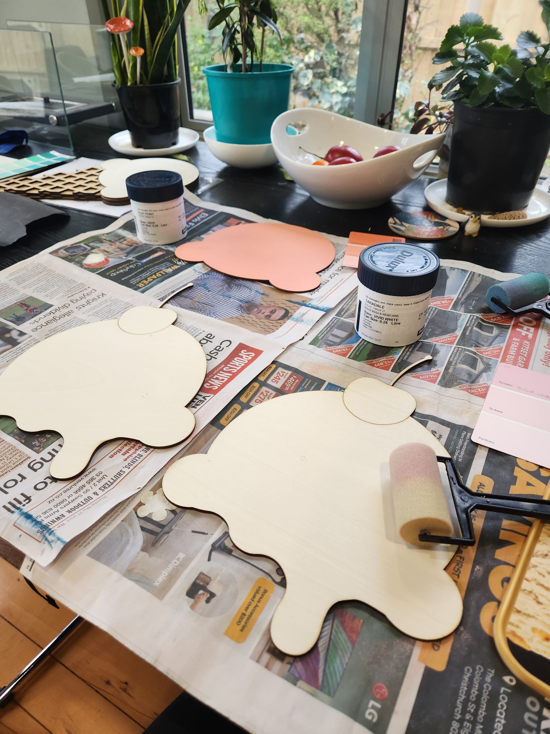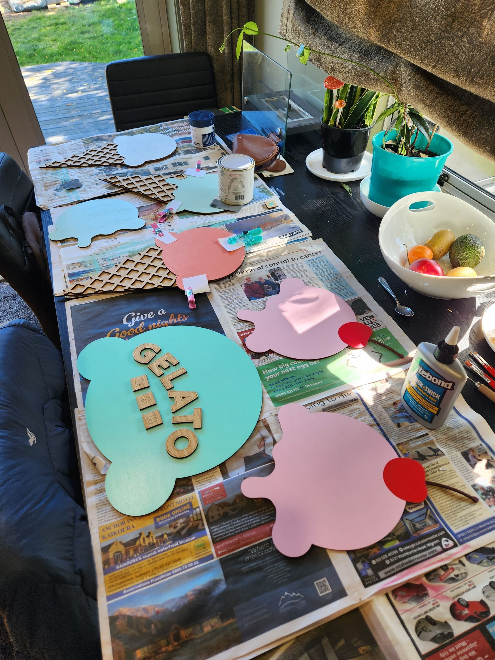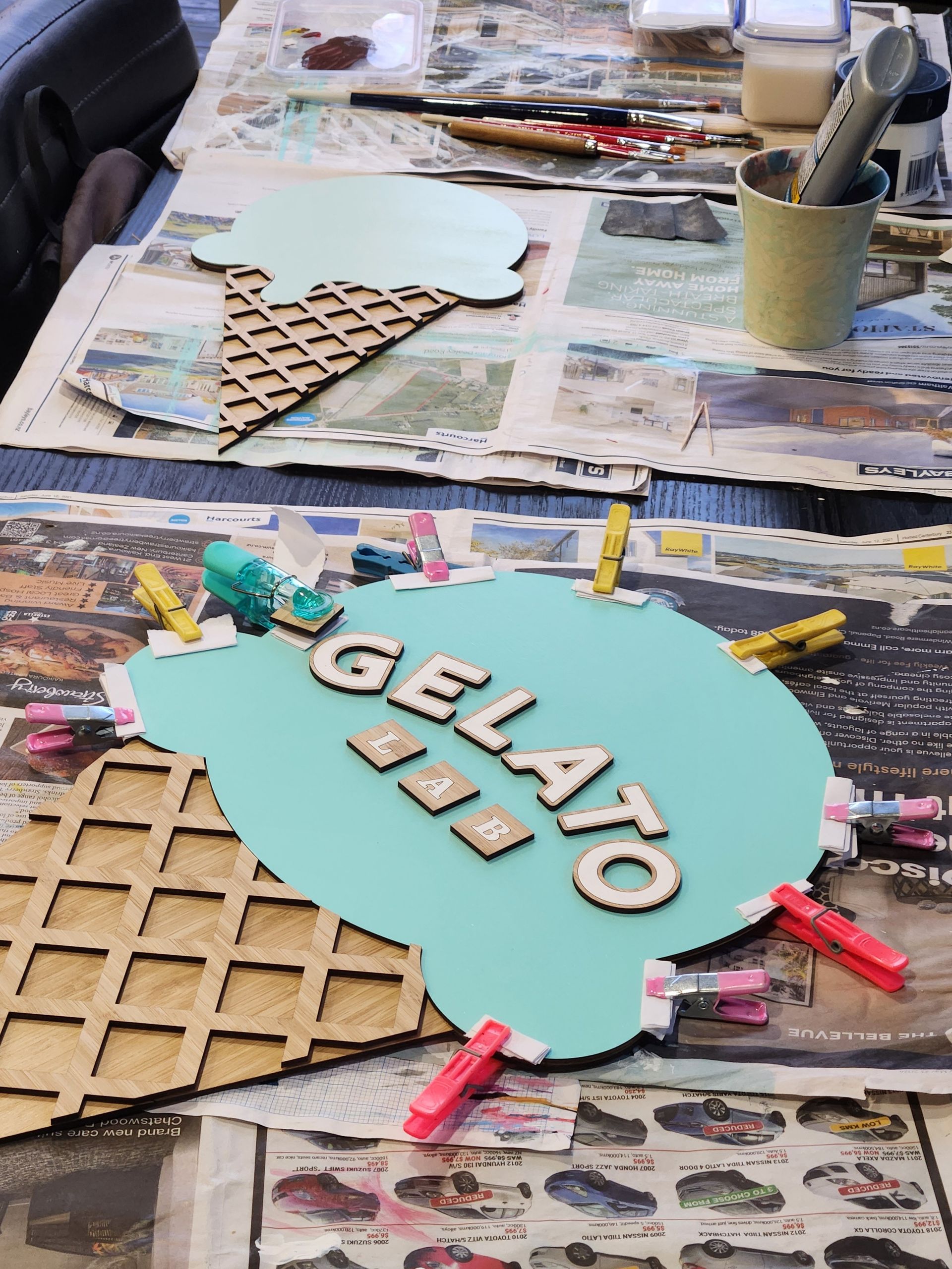 We are really happy with how our wooden wall artworks turned out! They look great on the wall and really add vibrancy and interest to the shop. Sending a huge thank you to The Gelato Lab for once again supporting our small business (we sell our ice cream earrings in their store!). This was our first large commissioned artwork and they supported us every step of the way.