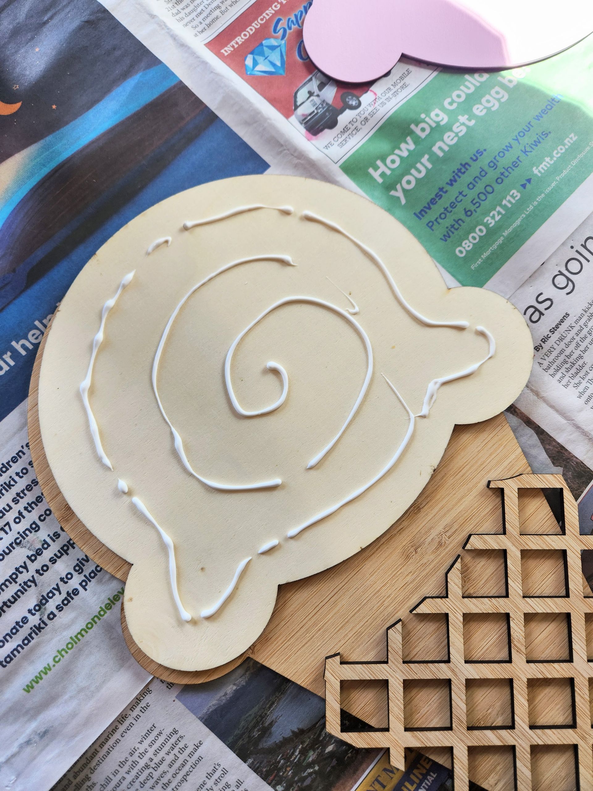 We used a strong PVA-like glue to bond our layers together. Wood can be quite difficult to work with in that it warps and bends, so we had to hold the layers tightly together using small clamps and pegs while the glue dried. We had to be careful not to let the pegs damage the surface of the painted areas. There was definitely a bit of touching up to do!