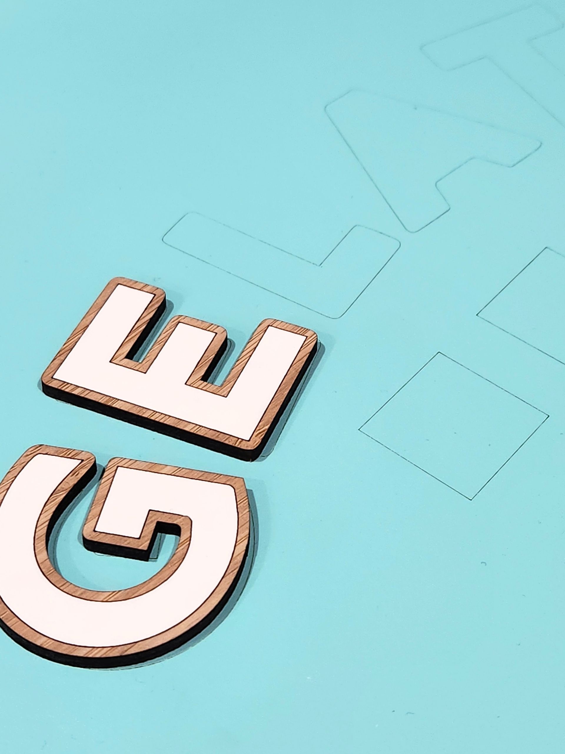 We also needed an easy way to figure out the placement of the logo's letting. To do this, we pre-painted the board before laser cutting this piece, and lightly line engraved the lettering into the paint to act as a guide.
